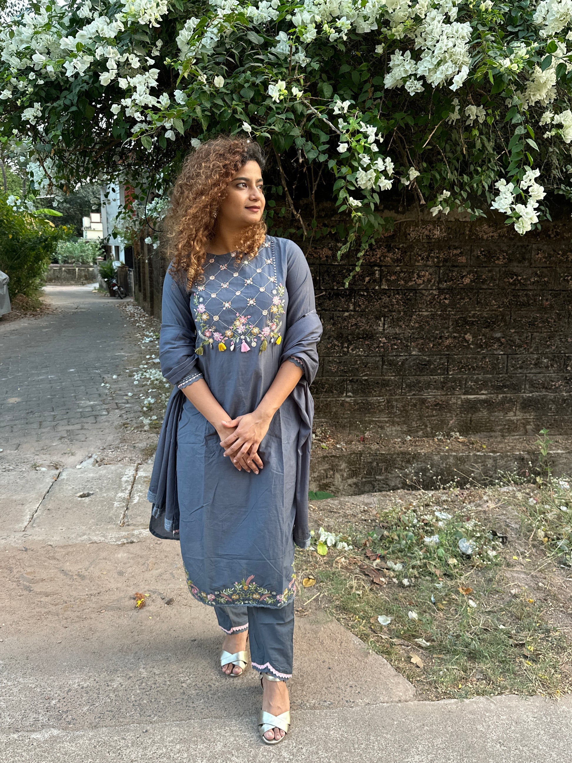Charcoal Grey Cotton Handwork Straight Suit